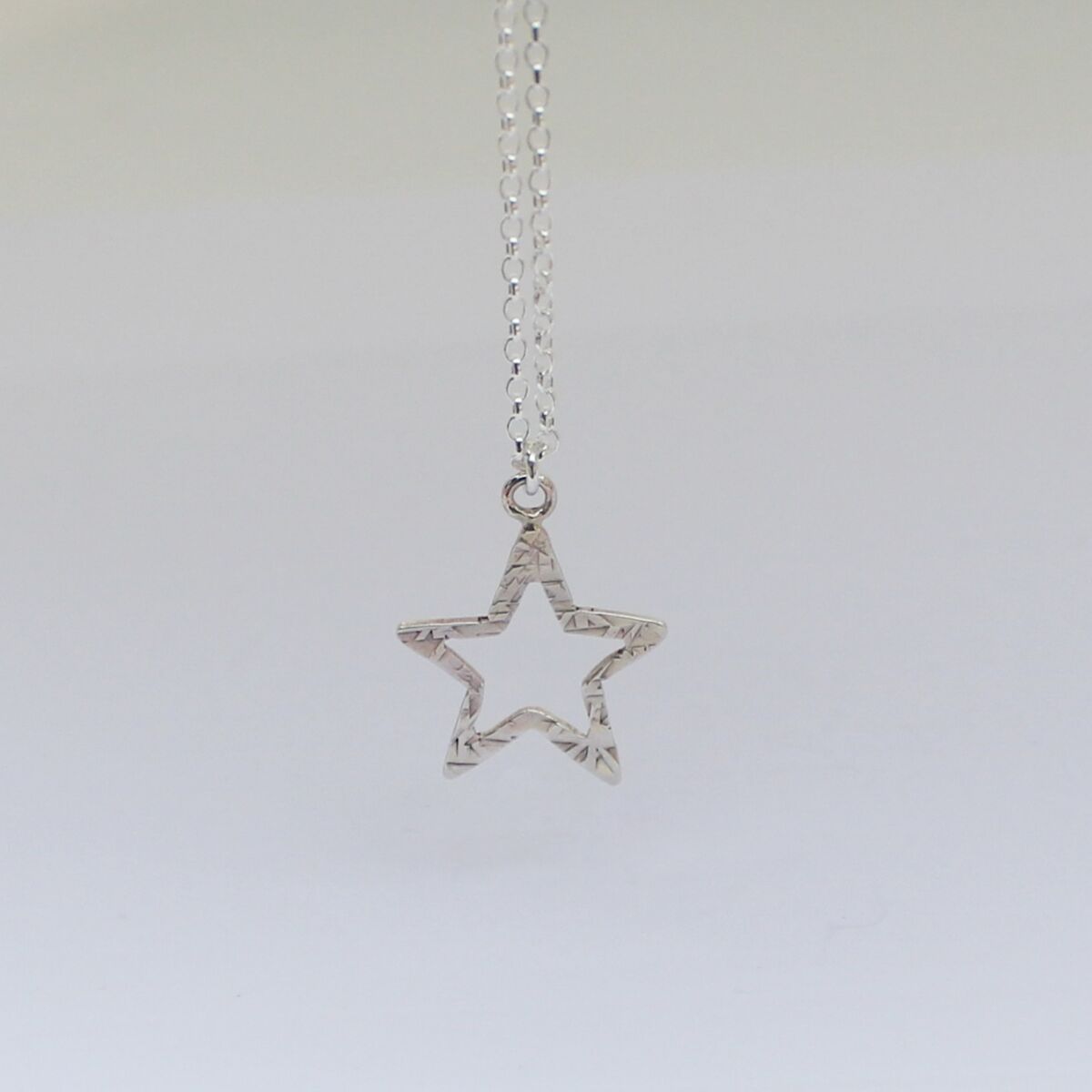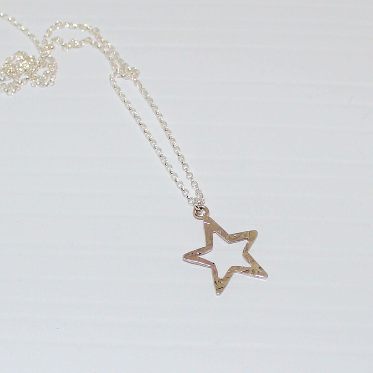 Handmade sterling silver cut out star pendant of approximately 20mm has been hammered with a texturing hammer to create surface pattern.