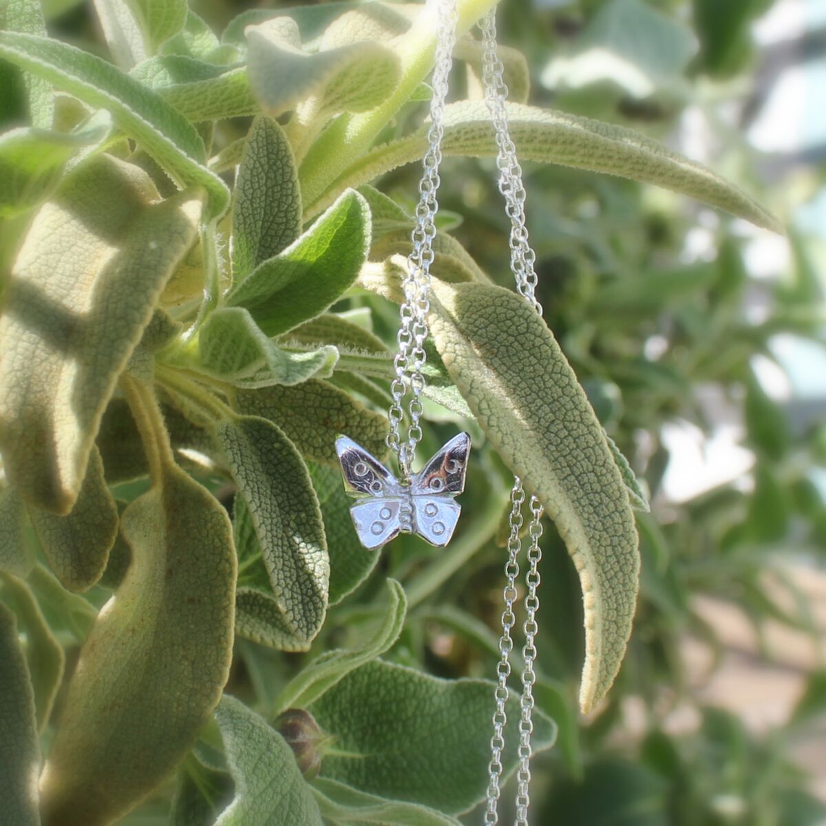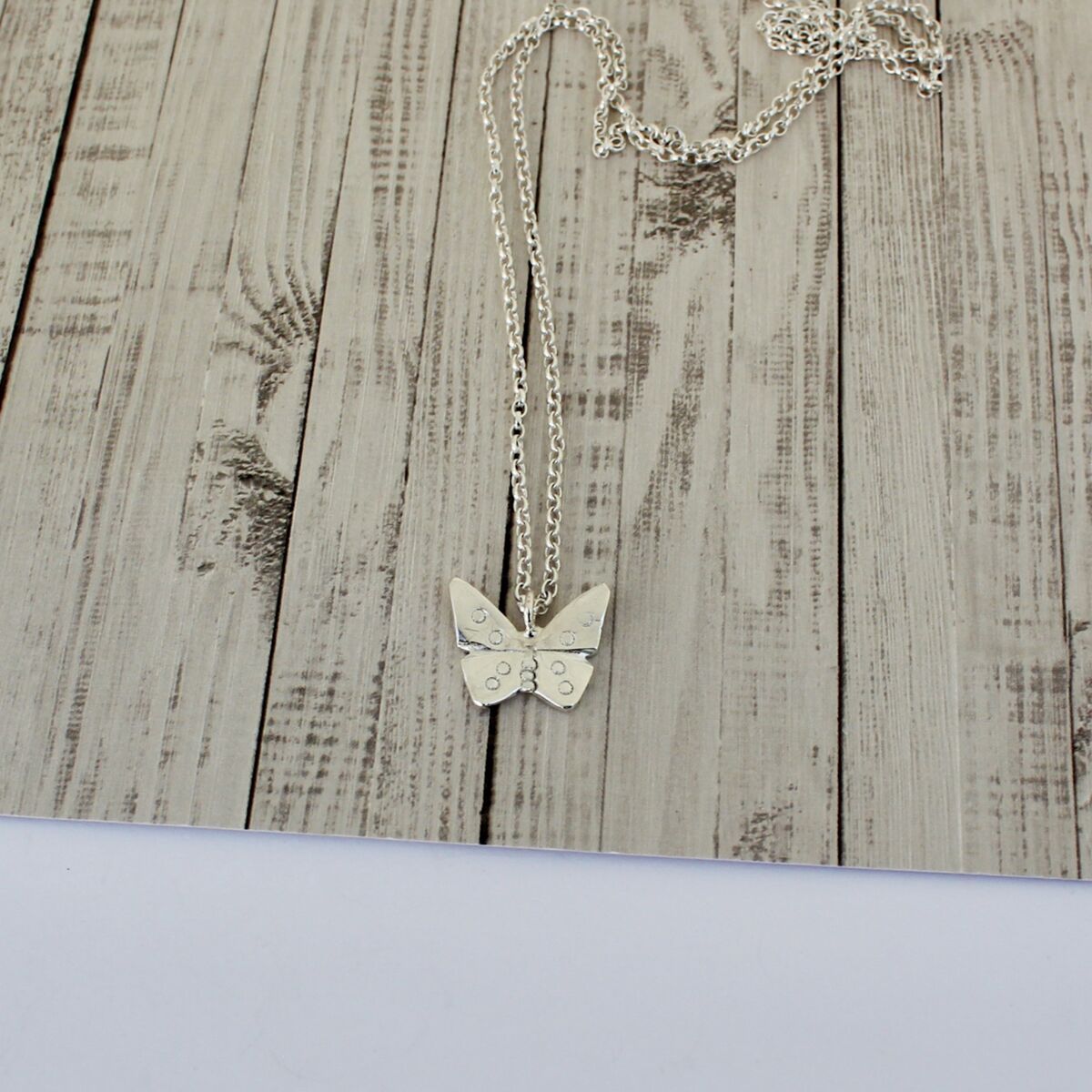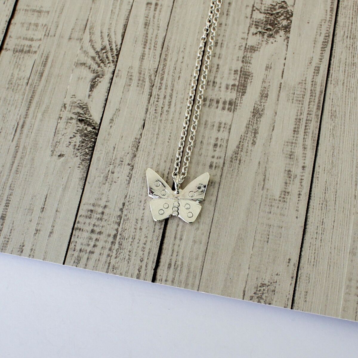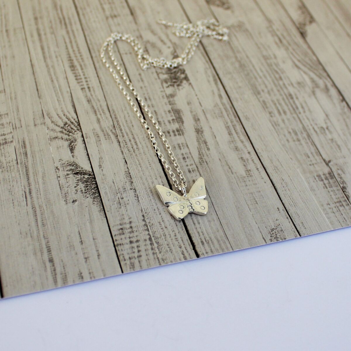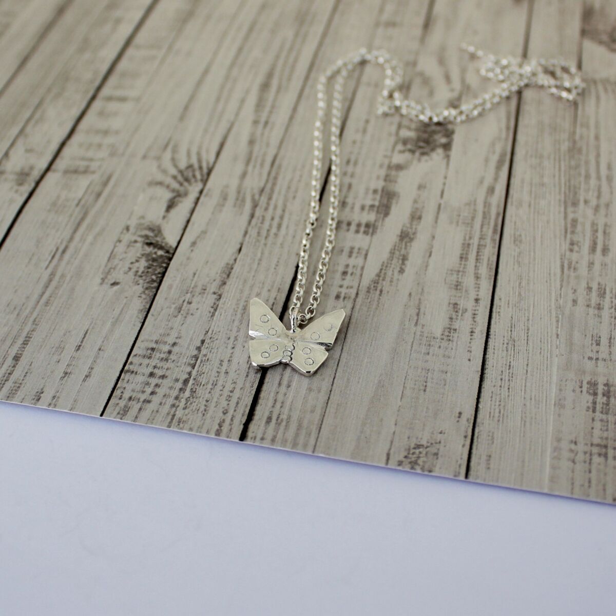 A handmade recycled silver butterfly pendant with a dotted surface pattern, which is approximately 18mm at the widest part of its wing span. A soldered jump ring holds this beautiful pendant onto sterling silver belcher chain available in different lengths.