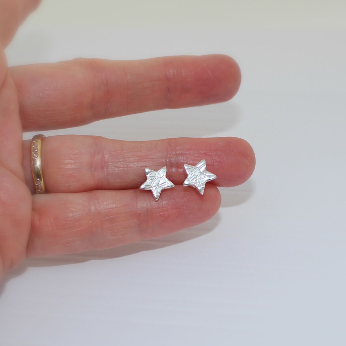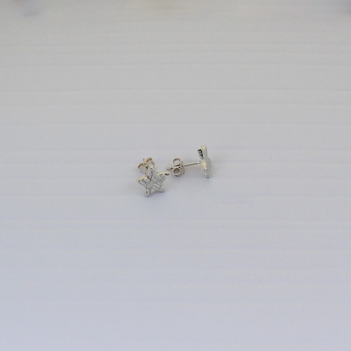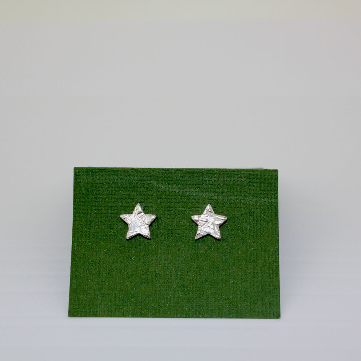 A pair of handmade sterling silver star shaped ear studs, with a textured surface pattern.