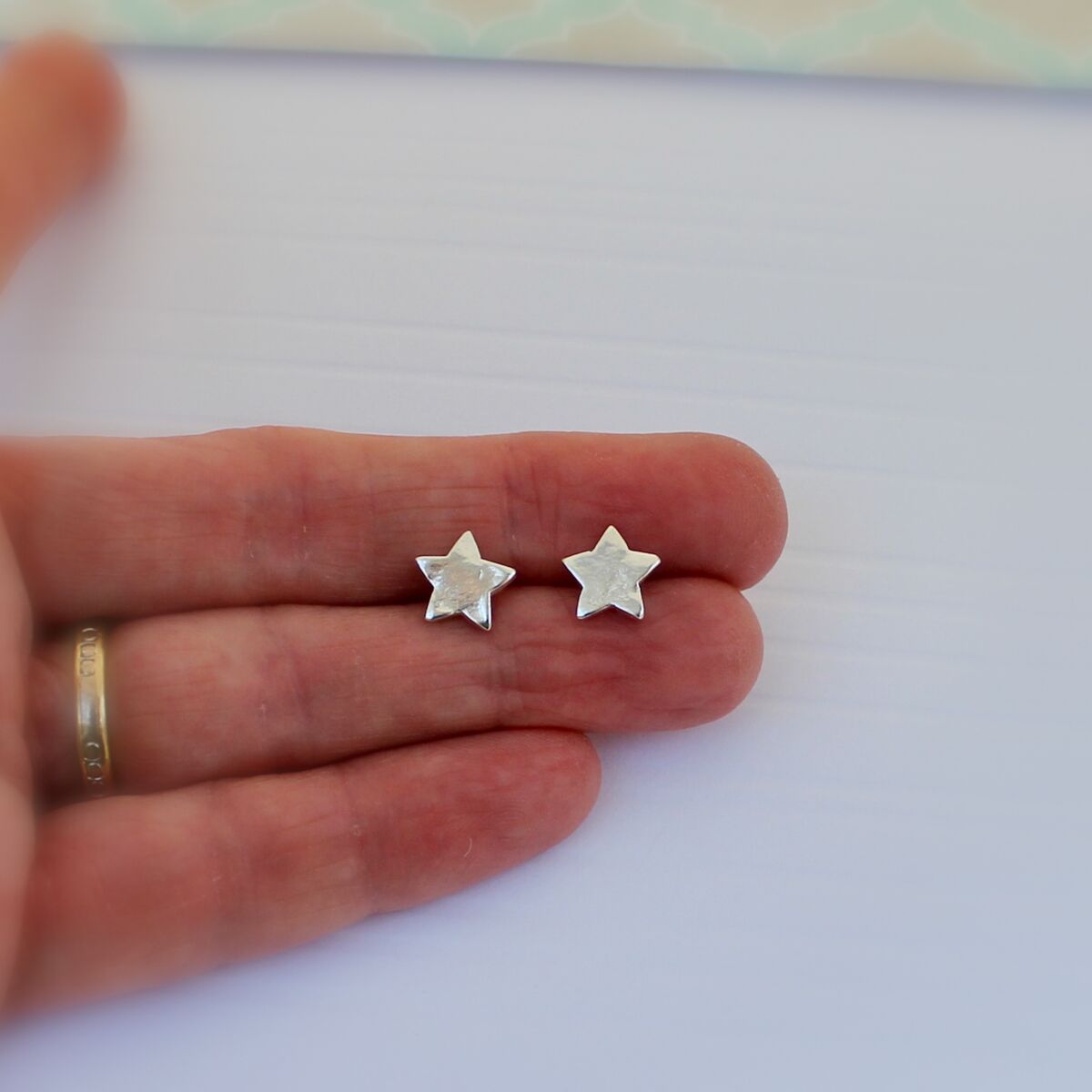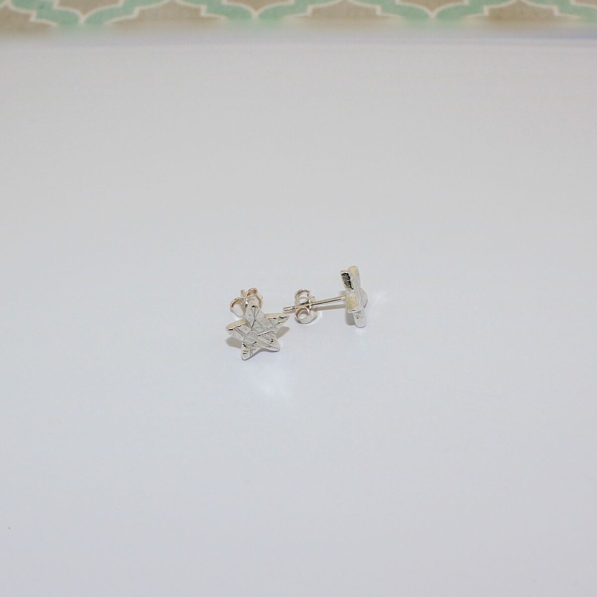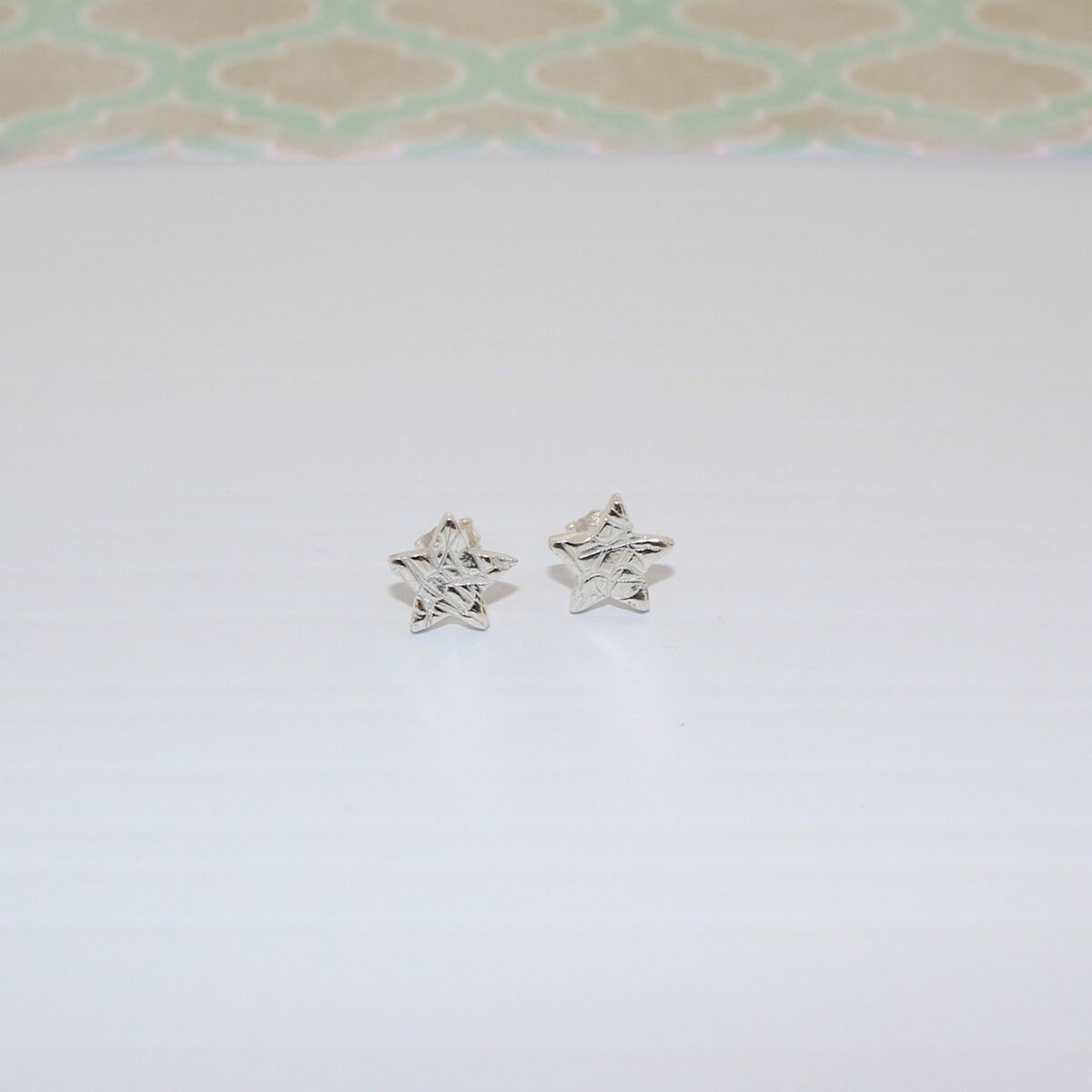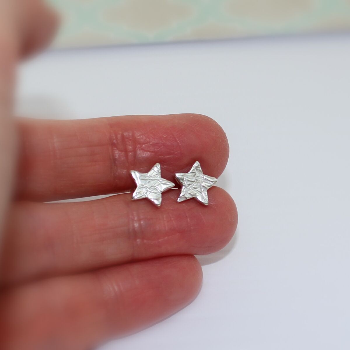 A pair of handmade sterling silver star shaped ear studs, with a textured surface pattern.