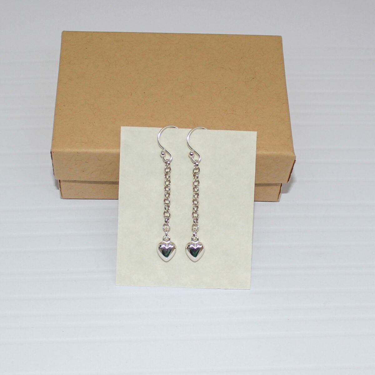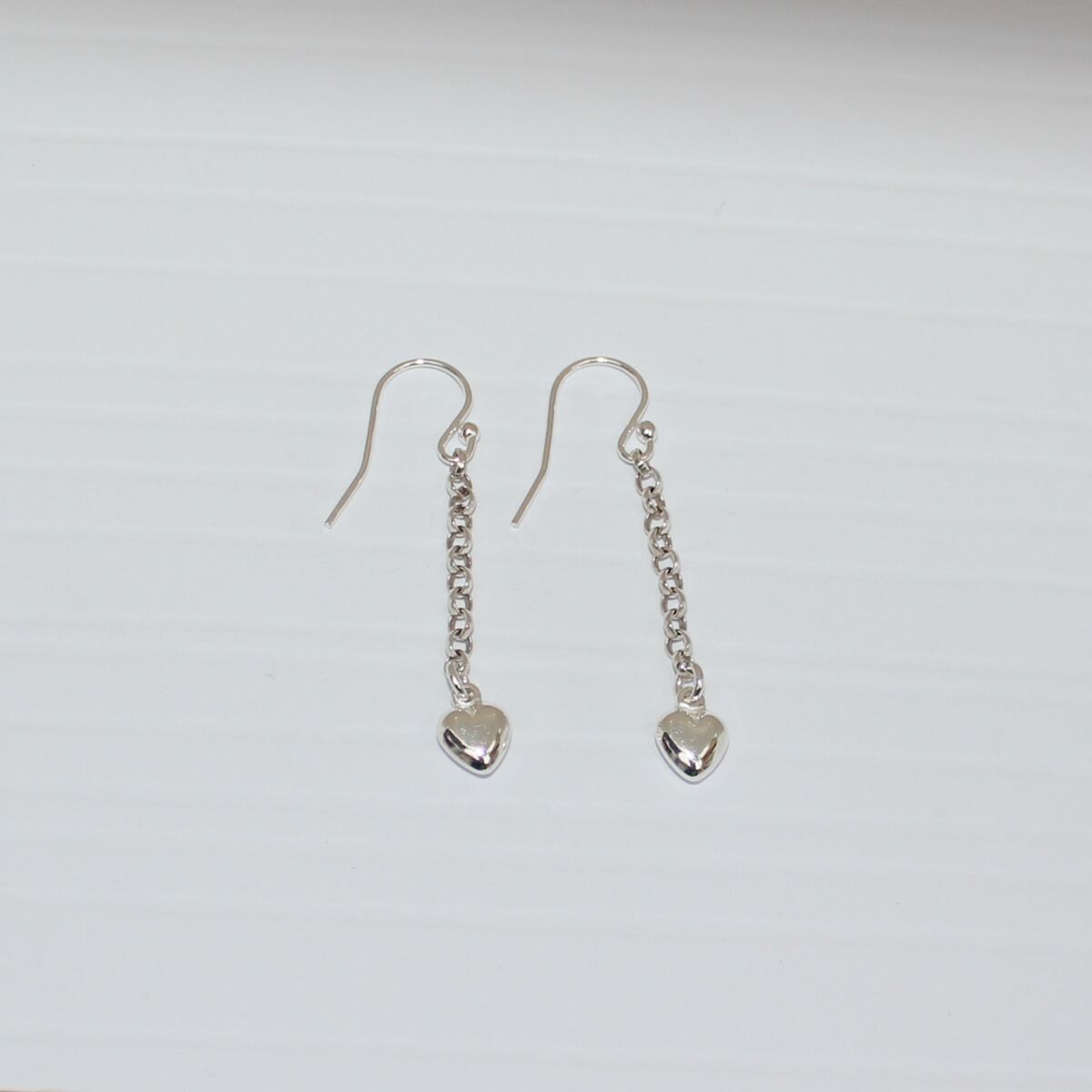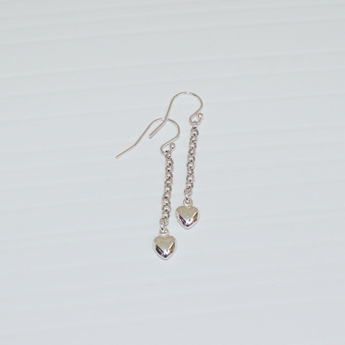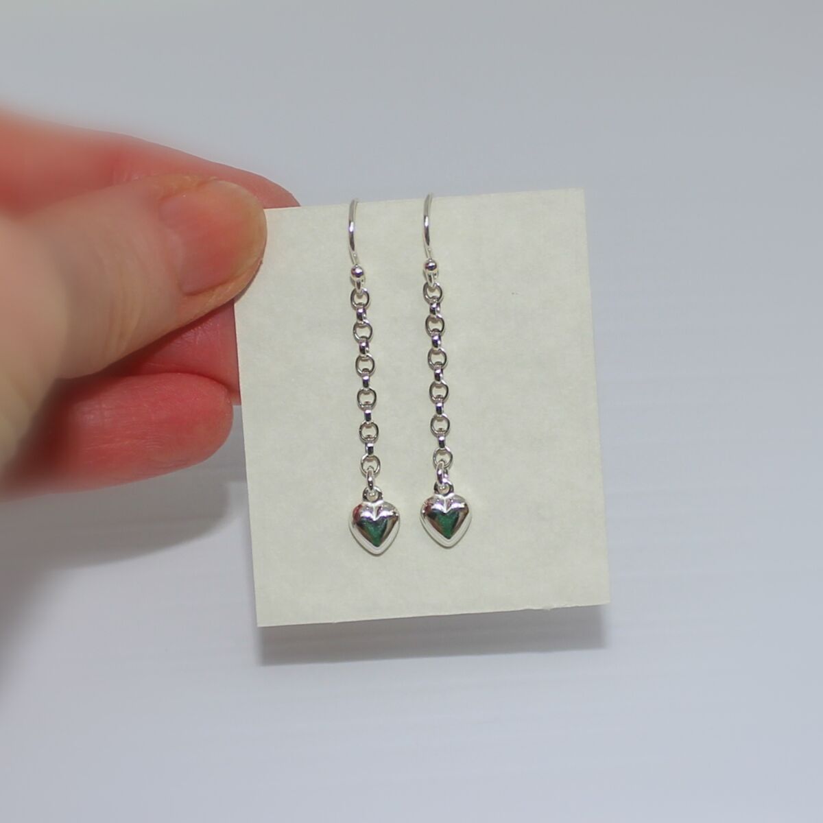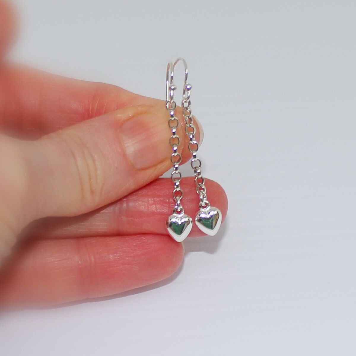 A pair of handmade sterling silver chain earrings with puff hearts. Held on sterling silver French ear wires, these designer earrings are approximately 35mm in length.