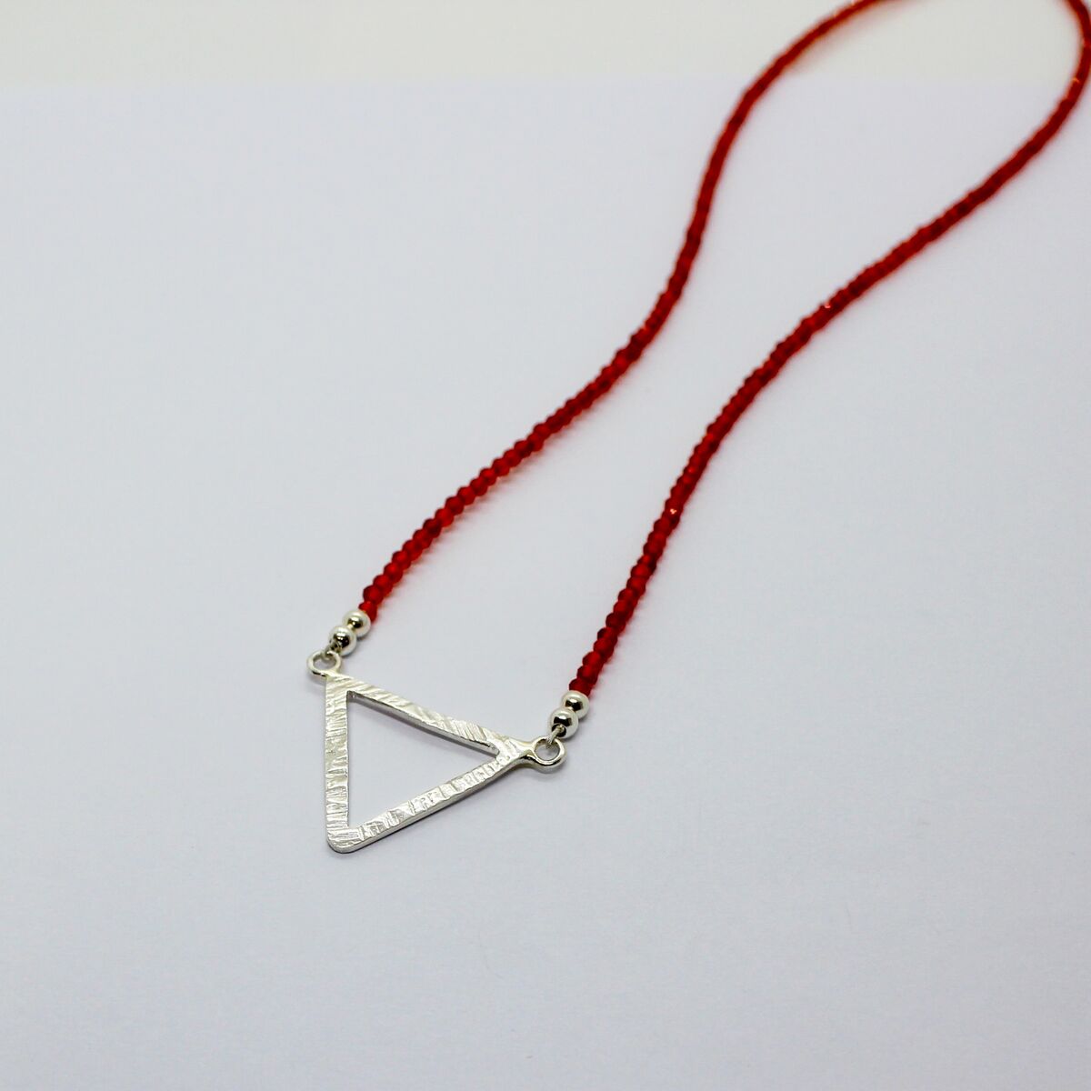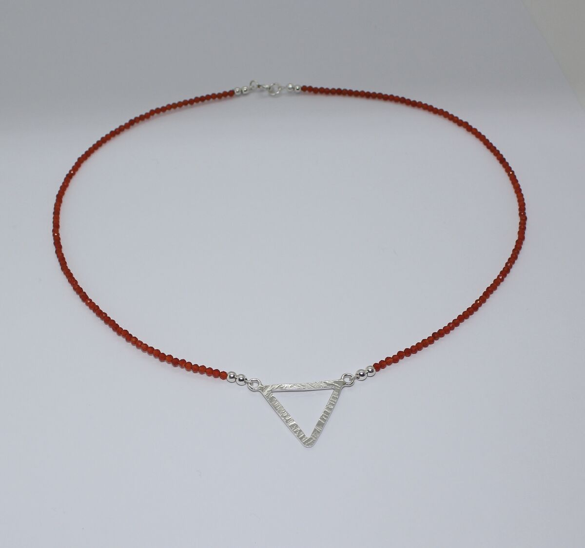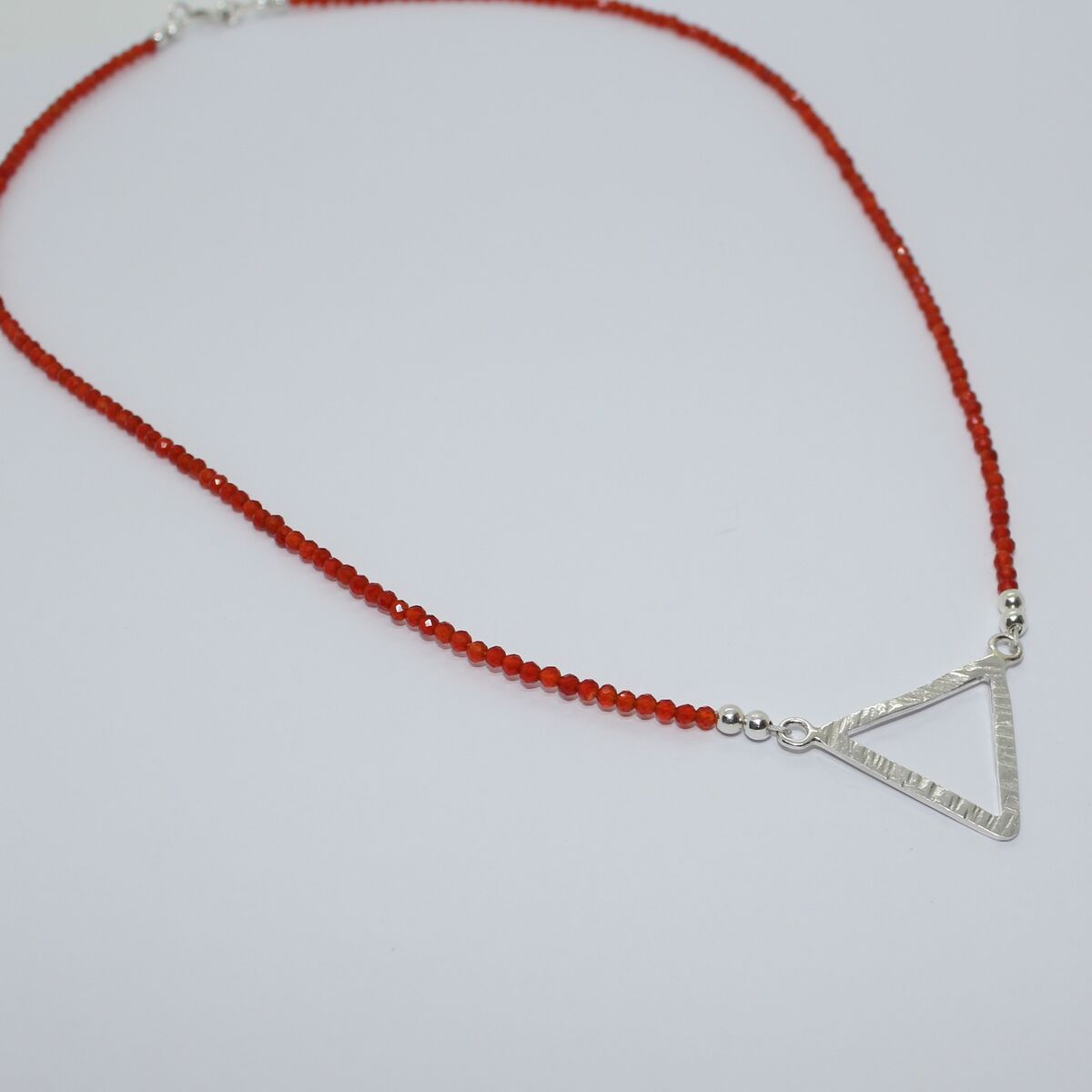 A handmade necklace with sparkling AAA Carnelian faceted beads held on silver plated wire, attached to a handmade sterling silver triangle pendant made from recycled silver and hammered for texture. Finished with sterling silver beads and components.