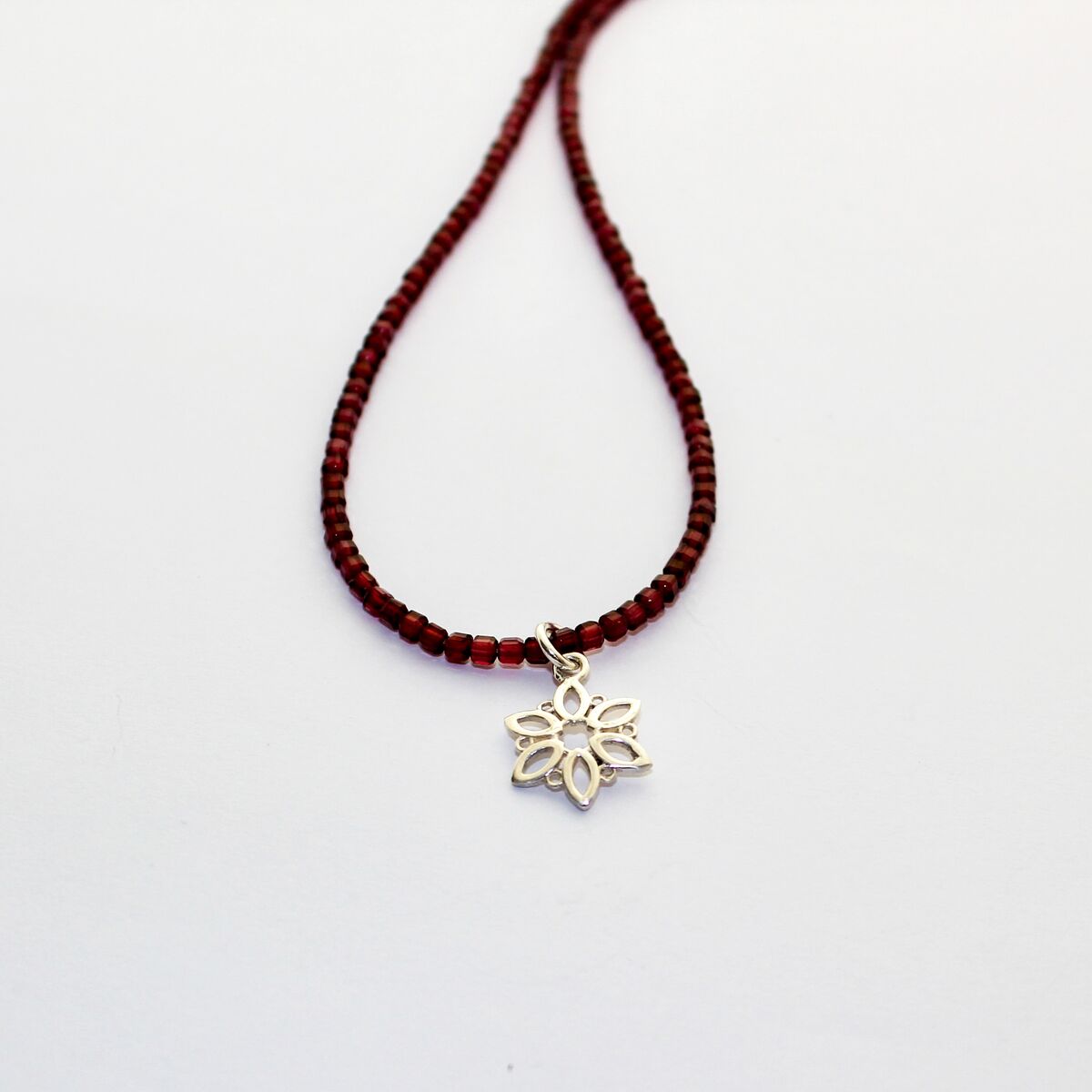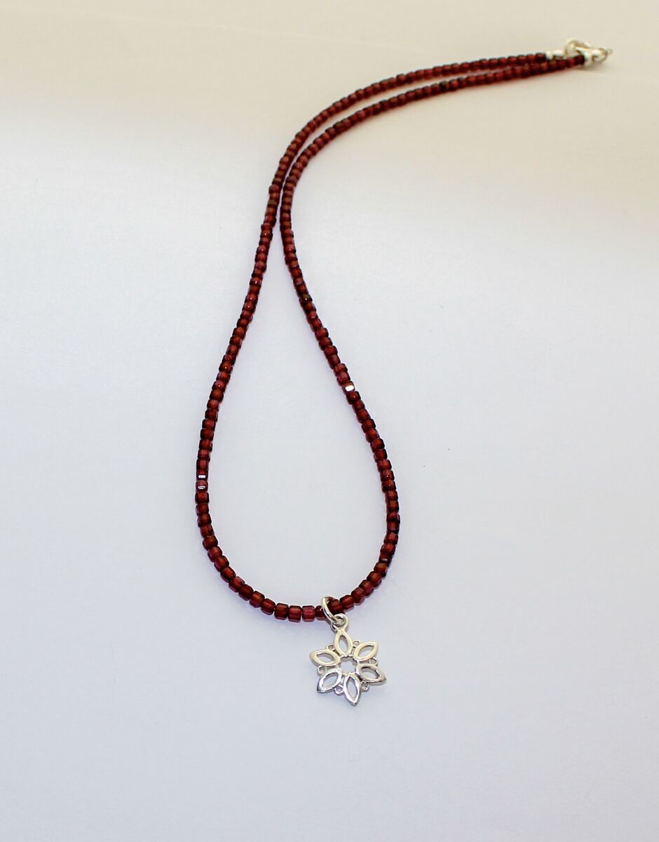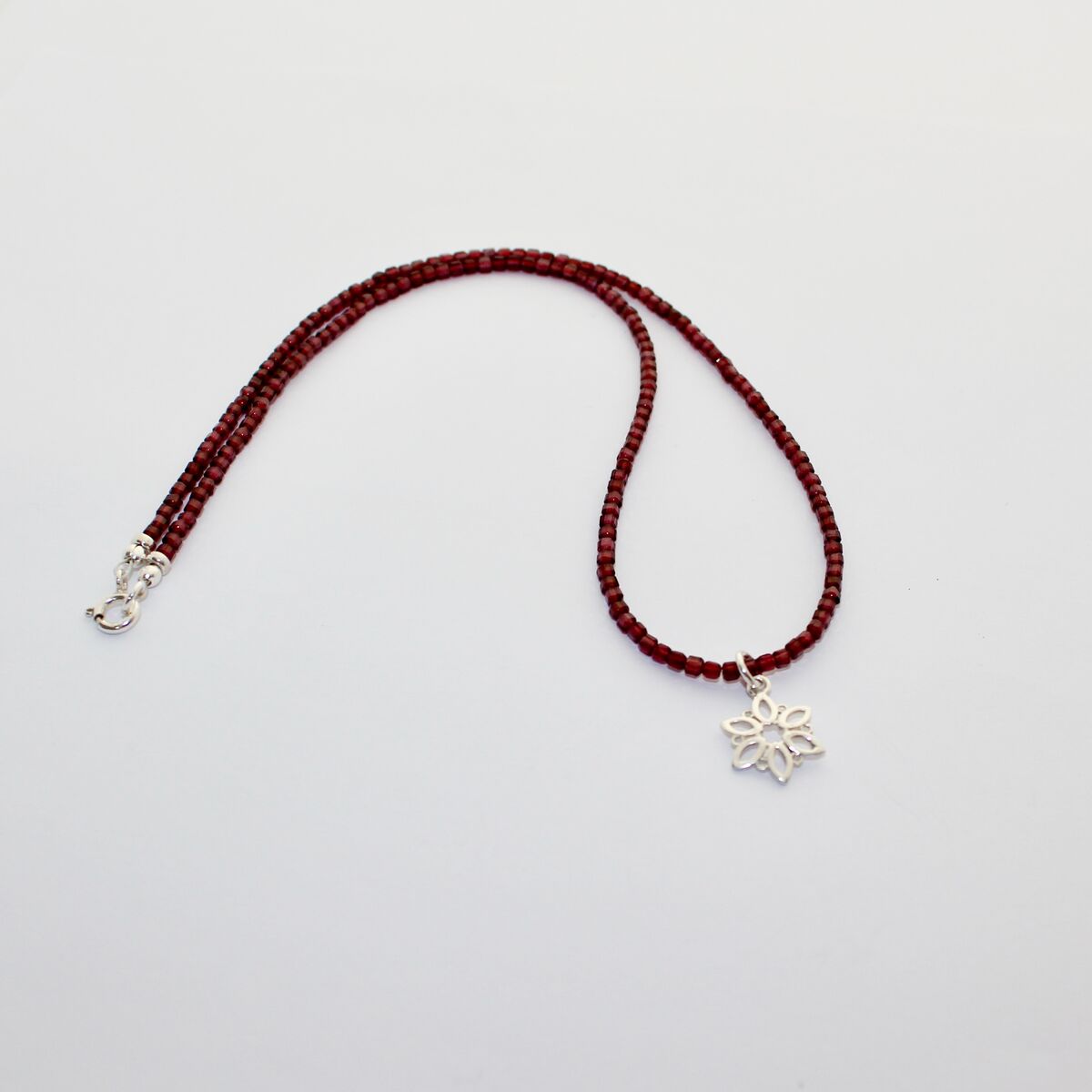 A handmade necklace with 2.5mm AAA Garnet faceted cube beads held on silver plated wire and finished with sterling silver components and a cut out flower pendant.