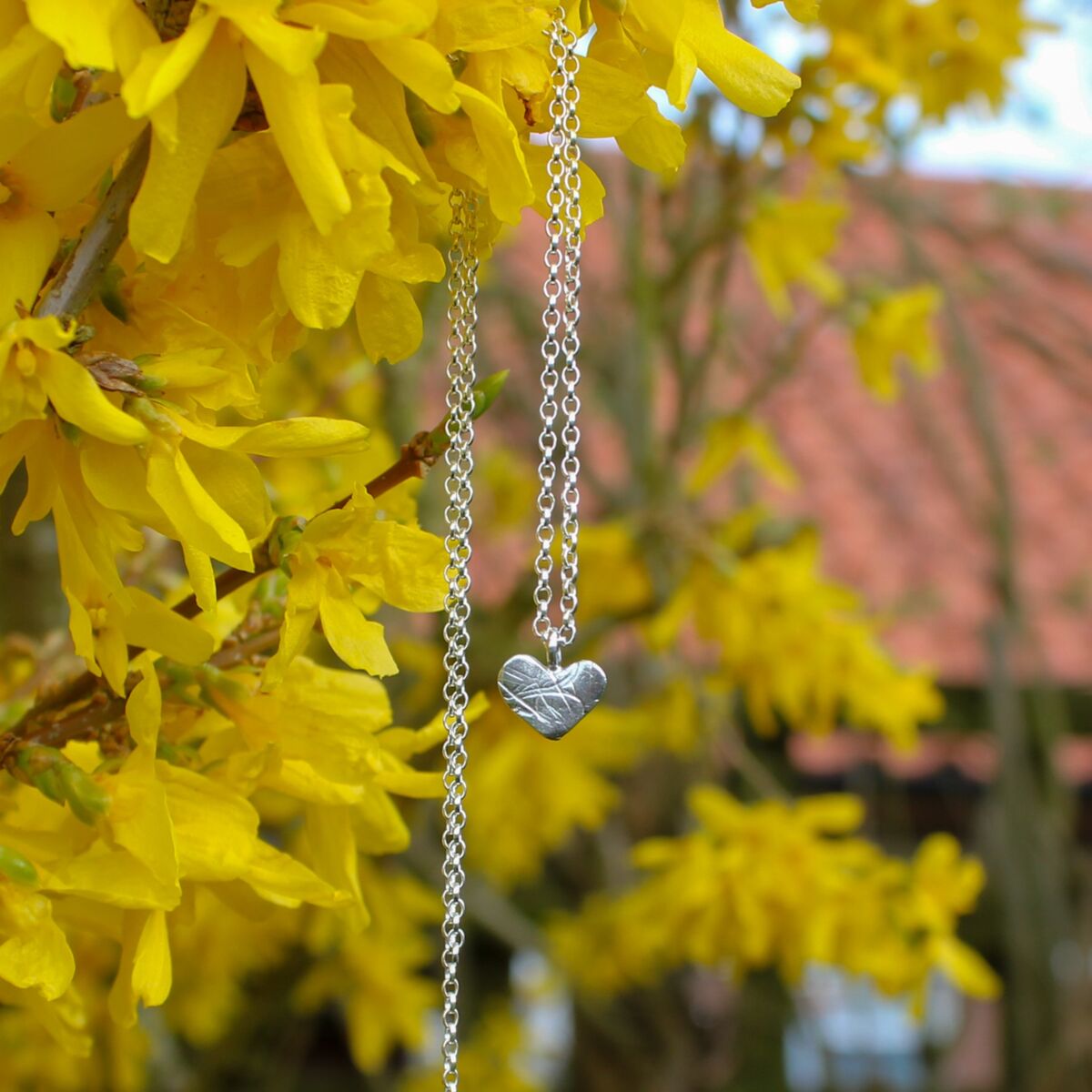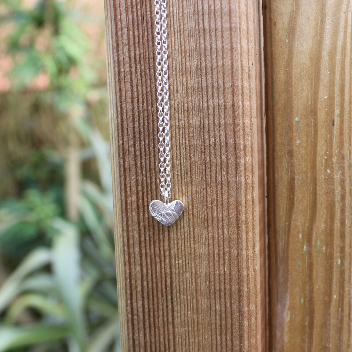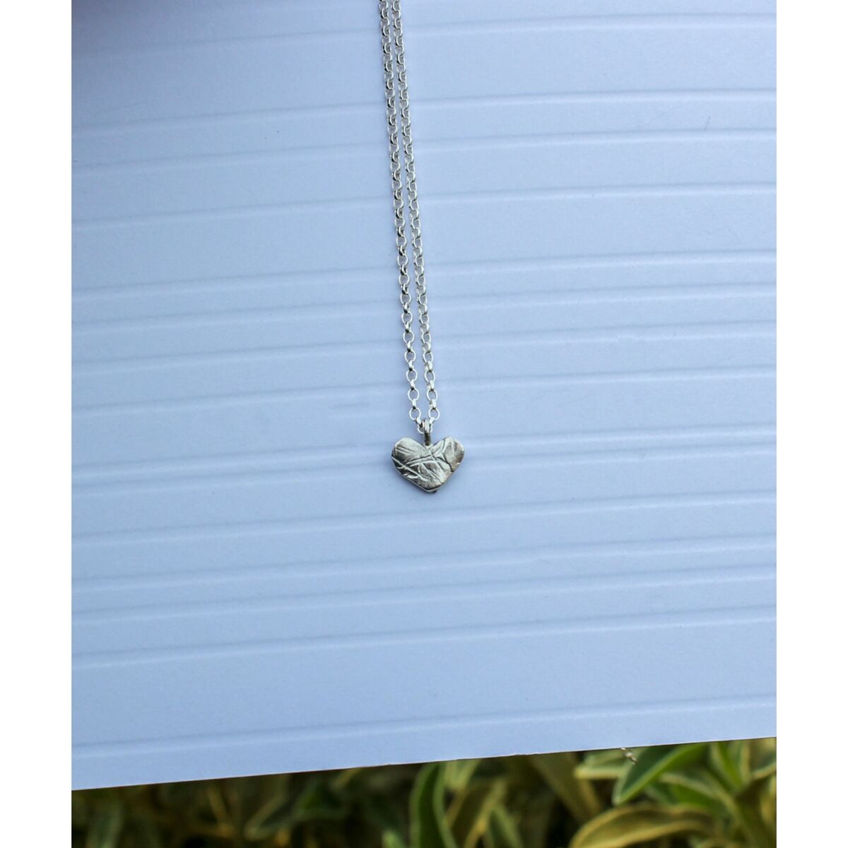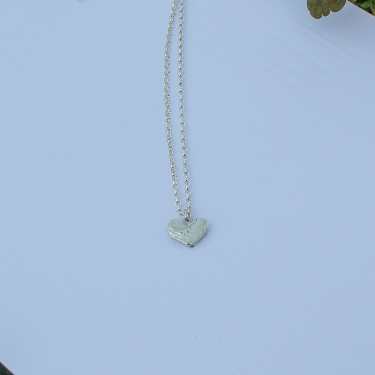 A handmade sterling silver heart pendant which has an unusual pattern design on the surface. Approximately 1.6mm in thickness and 10mm wide, it has a soldered jump ring where an oval linked belcher chain holds this unique pendant.