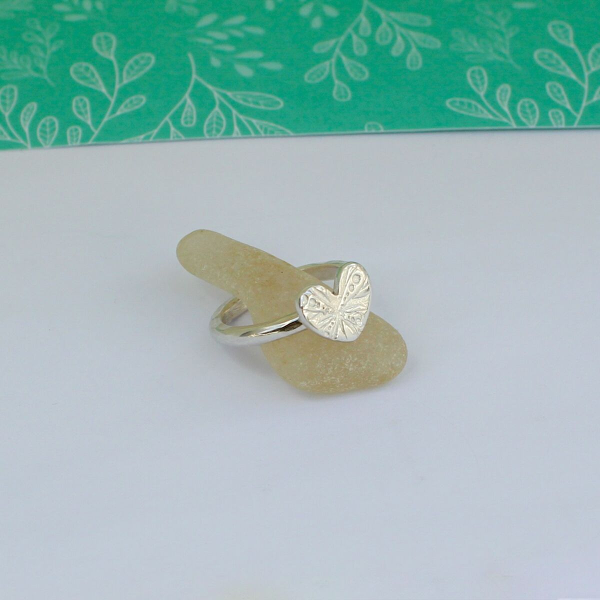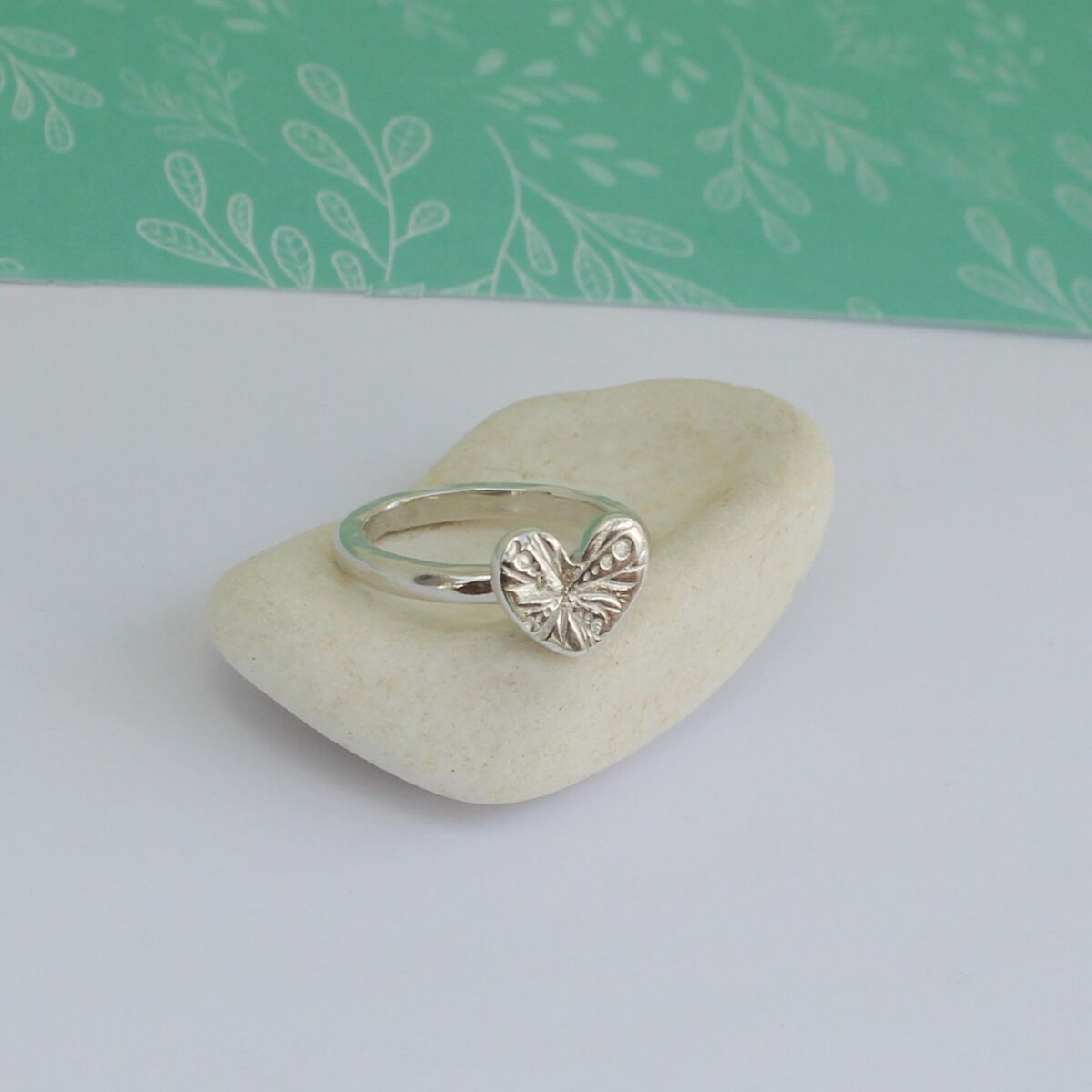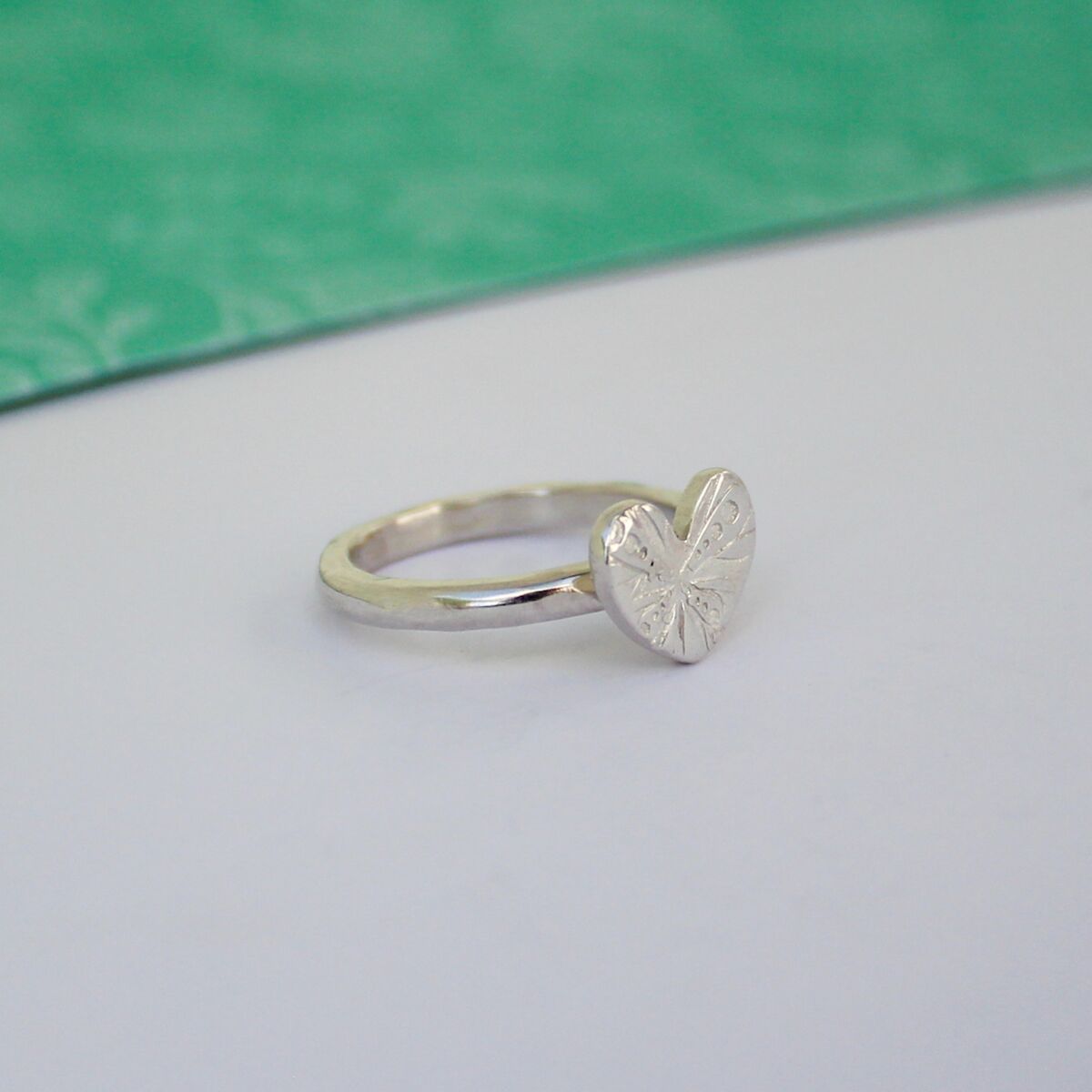 A handmade sterling silver ring which has a slight hammered texturing around the ring band edge, with a smooth outer surface. The heart has a gorgeous surface pattern which looks very striking and is approximately 11.7mm at its widest part and approximately 1.7mm in thickness.