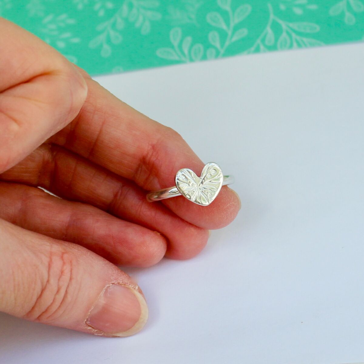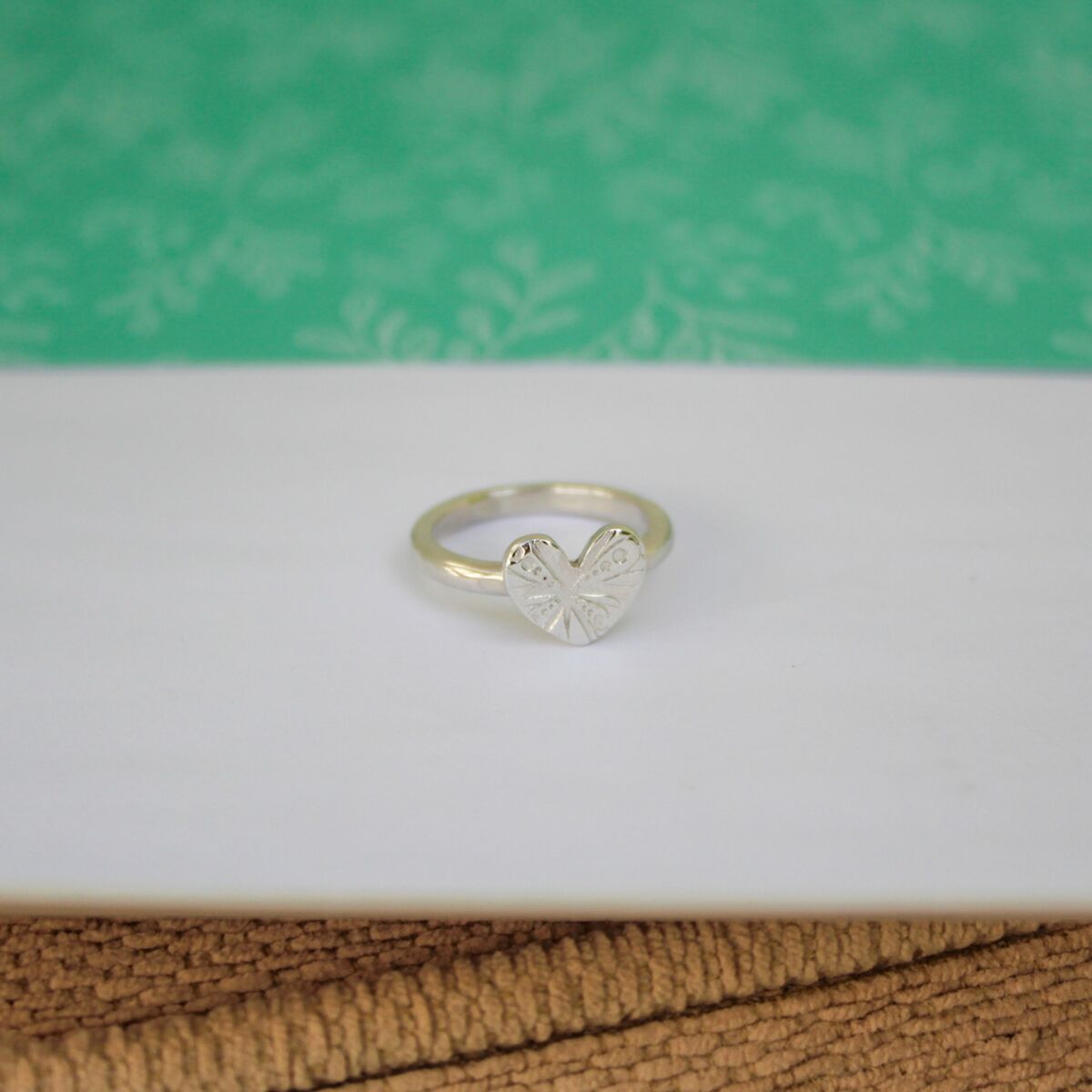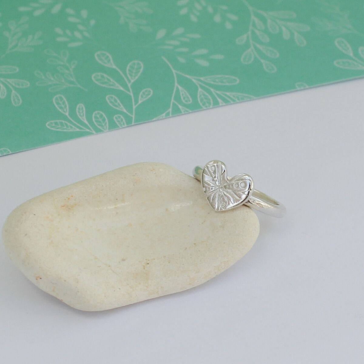 A handmade sterling silver ring which has a slight hammered texturing around the ring band edge, with a smooth outer surface. The heart has a gorgeous surface pattern which looks very striking and is approximately 11.7mm at its widest part and approximately 1.7mm in thickness.