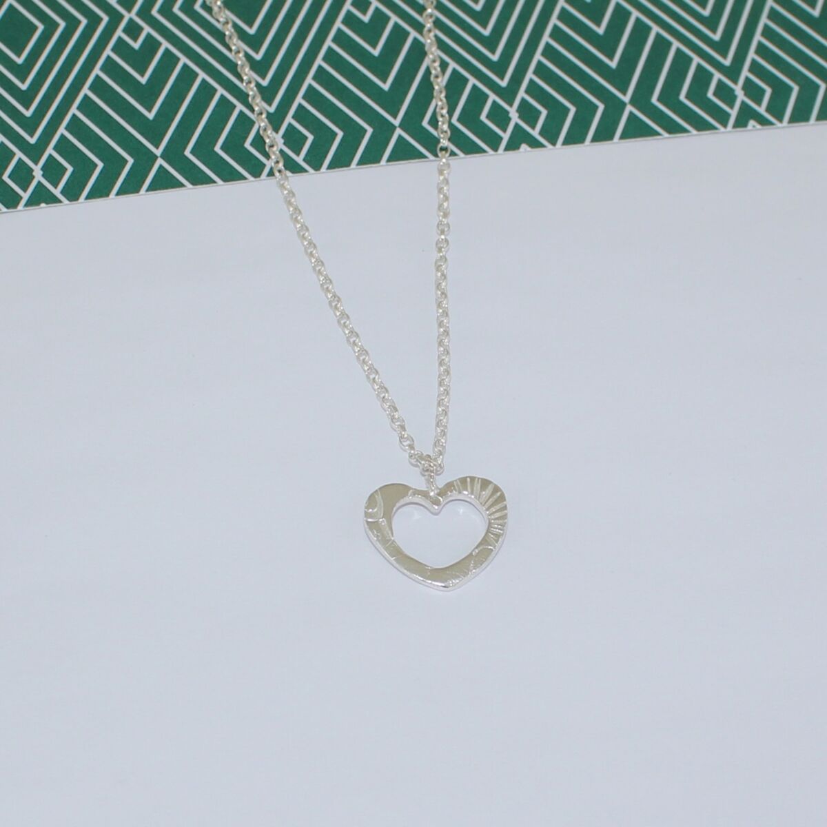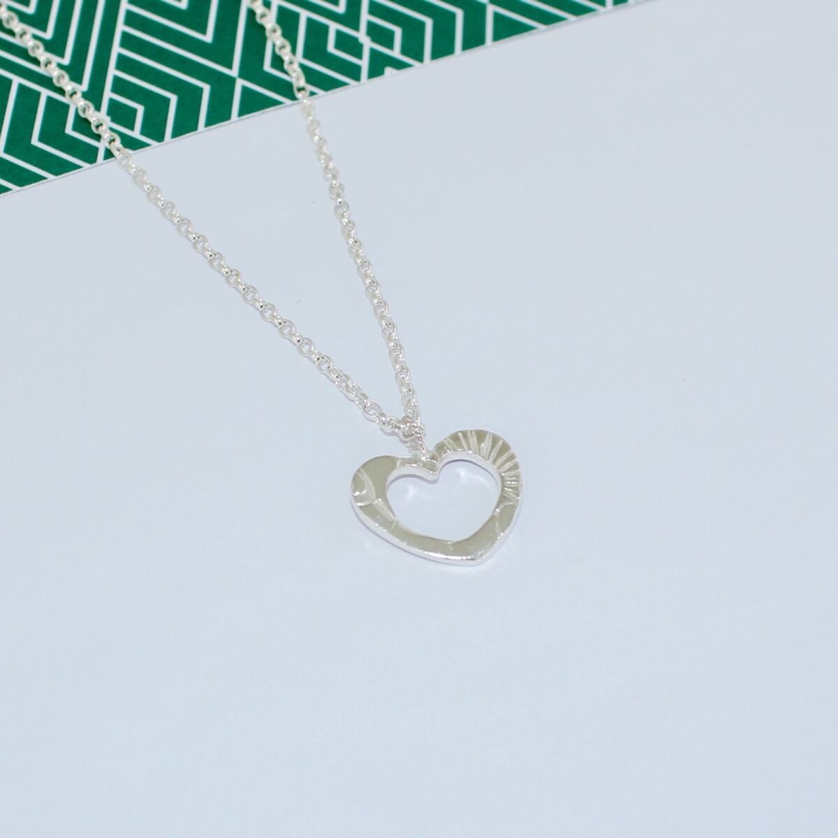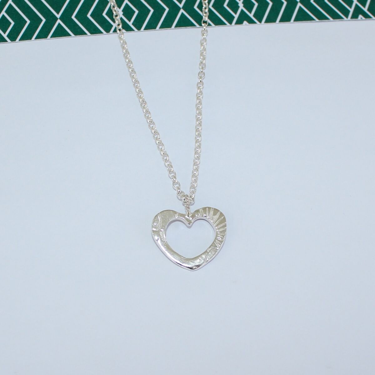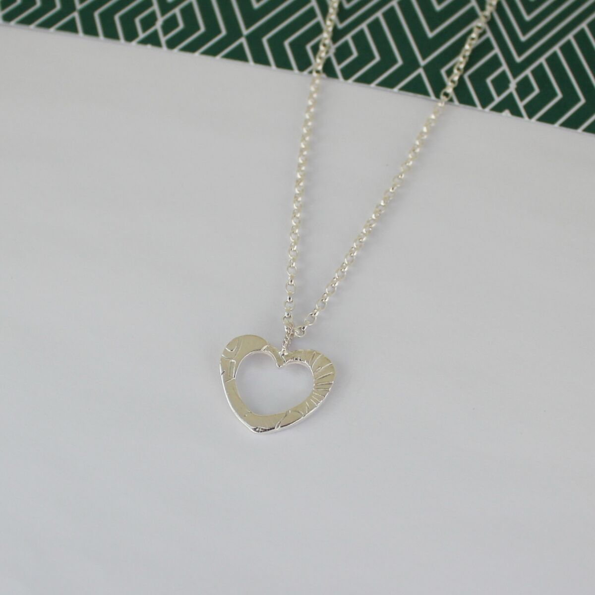 A handmade sterling silver open heart pendant which has an unusual surface pattern design on the face of the heart. A twisted silver wire jump ring is soldered at the top of the heart where sterling silver belcher chain feeds through, which is available in different lengths.